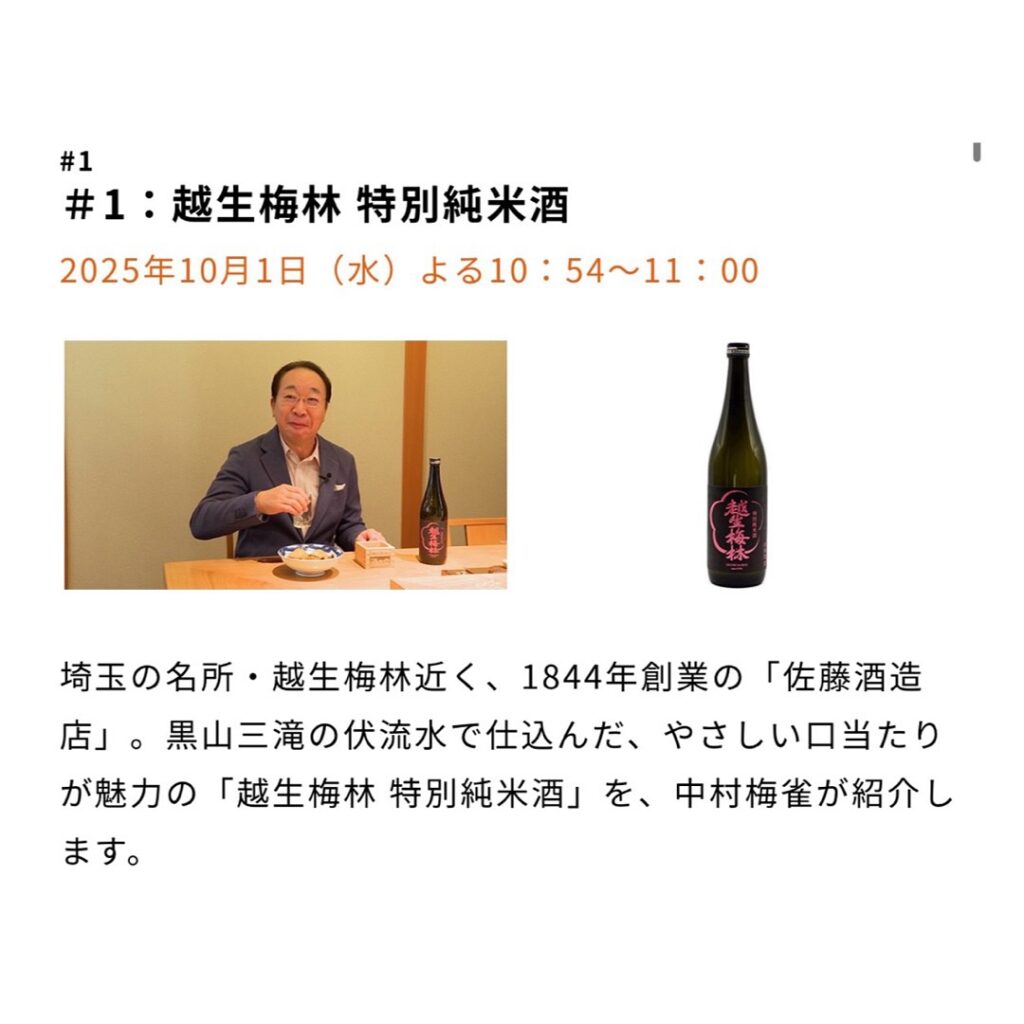 10/1(水)22時54分〜中村梅雀さんに【越生梅林 特別純米酒】を紹介していただきます。