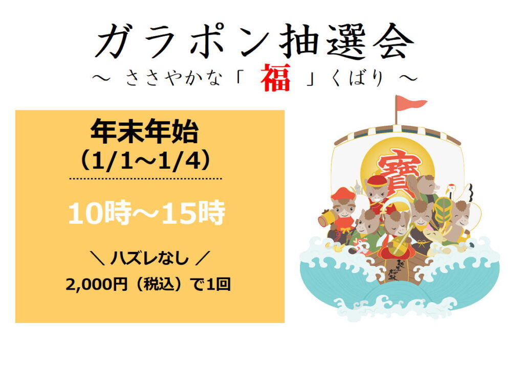 また、1月1日~4日までの期間中、店頭でお買い物いただいたお客様にご参加いただけます。当店人気商品のお酒など、ハズレ無しでご用意しております。